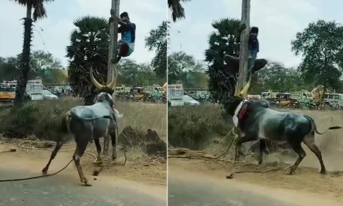 Ox Attack Video: পাগলা ষাঁড়ের হাত থেকে প্রাণ বাঁচাতে খুঁটিতে উঠলেন এক ব্যক্তি, পরের ঘটনা দেখলে শিউরে উঠবেন আপনিও
