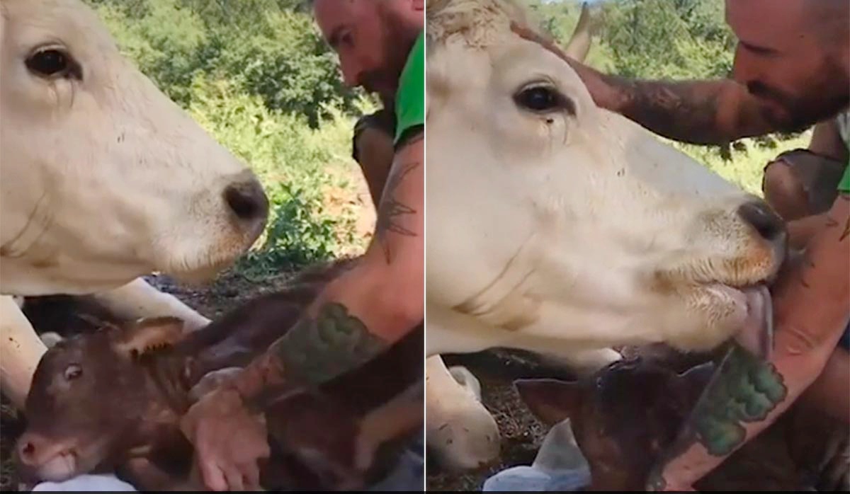 Mama cow shows gratitude to the kind man who saved her and helped deliver her calf